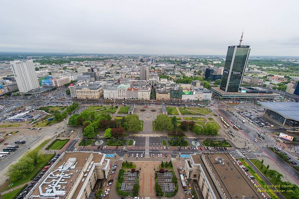 Von hier bietet sich ein weiter Blick über Warschau und über die Weichsel bis hin zum Stadion Narodowy. Auch der Kulturpalast hebt sich aus dem Stadtbild heraus. Aber das tut er - ähnlich dem Eiffelturm in Paris - von jeder Stelle der Stadt aus.