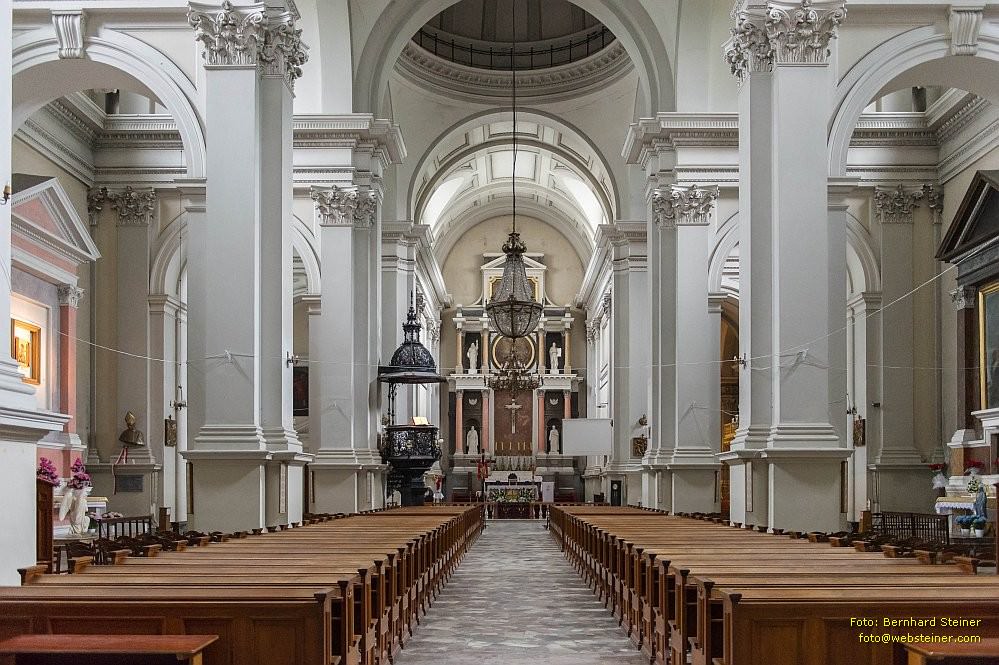 Der architekturhistorisch bedeutende Sakralbau ist eine dreischiffige Basilika mit Presbyterium, die mitunter auch als einschiffig mit seitlichen Kapellenreihen beschrieben wird. Die spätbarocke, dreigeschossige und in den Proportionen grazile Fassade ist von Säulen und statuenbesetzten Nischen geprägt und mit einem zierlichen Rokokodekor versehen.